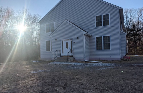Spacious duplex (1600+ SQ Feet)with full kitchen, washer and dryer in unit, on 4+ acres to enjoy. Master Bathroom has jacuzzi tub in addition to shower. OTHER SIDE OF DUPLEX IS OWNER OCCUPIED. Home is set back 800+ feet off main road on an old christmas tree farm. TVs in living room and master bedroom with Netflix. Property located off RT 202 for easy travel to surrounding towns, colleges, hiking trails, and various attractions. NO PARTIES. Feel free to contact us with any questions! You will see our pup Gronk, as he spends much of his time in the yard! I do own my business and work out of my garage so expect to see several boat engines in and around the garage.