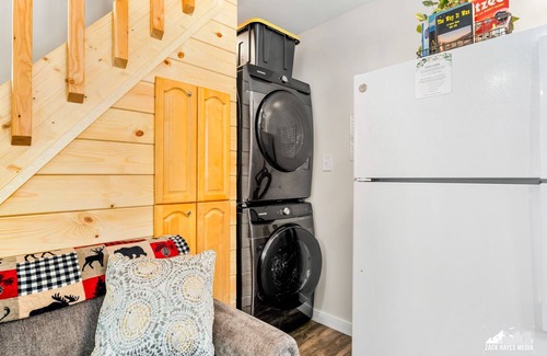 Tucked away on the back side of our 5 acres in a sprawling quiet neighborhood is our Fireweed Cabin. Upstairs there is 1 queen bed and a loveseat to take a nap or relax. Or with the FAST WIFI, you can stream your favorite show on the 50" Roku tv. Downstairs there is a sofa bed that opens into a single bed. There is a small dining table for 3, a fully equipped kitchen with olive oil, some needed spices, misc. snacks, K-cup coffee machine, and a full bathroom with a bathtub/shower with shampoo, conditioner, and body soap. There is a Front load washer/dryer with laundry soap and dryer sheets downstairs.