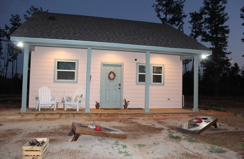 Unwind at this charming off-grid cottage with a fantastic porch on 21 acres to explore. Enjoy this brand new construction that offers total relaxation or go into town to Nacogdoches with bars, shops, restaurants and Stephen F. Austin University. The small cottage has one queen bed and three bunks, but the bedrooms do not have doors or closets. It is run off of solar power and ground water so enjoy a vacation while you reduce your carbon footprint.