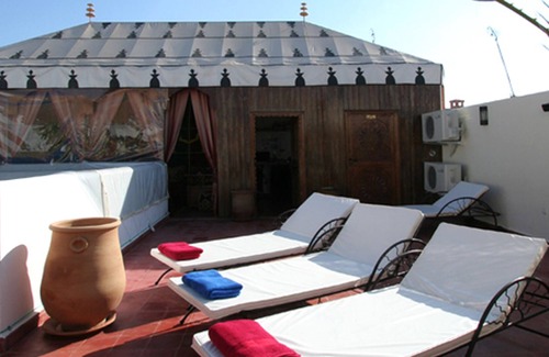 The terrace of the riad has a solarium and a Moroccan traditional tent, where you can take your breakfast or diner. It offers a view over the Atlas mountains and the old Marrakech-Medina.