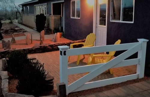 Country seclusion, 4 minutes to downtown, private entrance and patio with seating to enjoy the endless view in the day, the infinite stars at night. Easy parking, no steps or stairs, and thoughtful safety features. Food area has microwave, coffee maker, fridge, dishes, glasses, utensils, snacks, coffee, tea , WiFi, sundry extras. Need more? Ask ! Your hosts, Happy and Kathy, want you to feel at home.