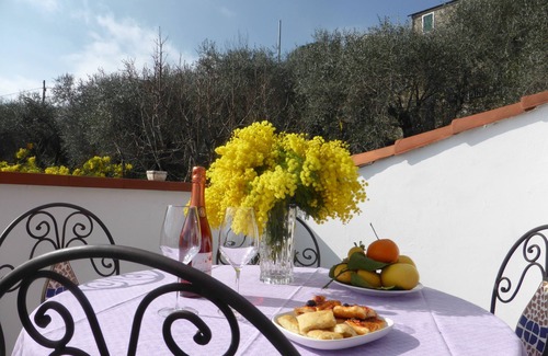 The detached house stands on the edge of the Ligurian mountain village of Pantasina. The apartment is on the top floor and has a large terrace of approx. 35 square meters with a wonderful view. Here you can comfortably and undisturbed enjoy the sun and drink a glass of wine in the evening. A small grill is ready. In Casa Clara you will find two separate bedrooms, one with a double bed and one with a bunk bed. You can access the rooms directly from the spacious, well-equipped kitchen. There are no through rooms.