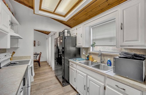 This 2 bedroom 2 bath has a large primary bedroom with high ceiling, walk a few steps into the bathroom that has a soaking tub and separate shower with loads of natural lighting thanks to a large sky light and windows. Smaller bedroom has 2 twin beds and gives a vintage vibe complete with antique dresser. There is a separate dining area from kitchen as well as a small wet bar space with seating for 2. Living area is the star with a soaring wooden ceiling, fireplace, work space, plenty of space to relax, watch the smart tv, read, etc. Cute outside patio just outside the kitchen door complete with bistro set and a fire pit with seating for 4-6. There is also another patio outside of the living room with a fenced yard and room for a pet or children who want to play.