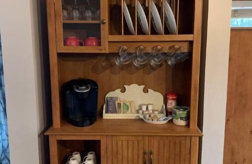A full kitchen with a large island to accommodate all your basic needs including: a Keurig, pots, pans, cutting board, dishes, utensils, paper towel, microwave, oven, and refrigerator. Bathroom is fully stocked with essentials and bath towels, wash cloths, shampoo and conditioner, and a hair dryer.
