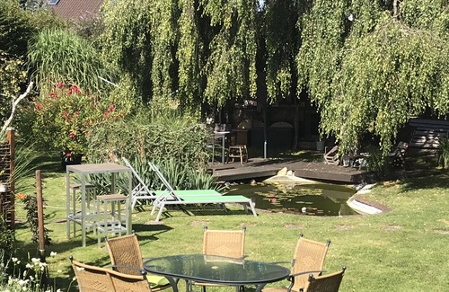 The double room was lovingly furnished. A room with 23 square meters, a tea kitchen, separate bathroom with floor-level shower and toilet is available. This double room can be booked for holidaymakers, business travelers and fitters with a certain standard from just one night. The private room is equipped with an oiled wooden parquet floor, a box spring bed with an extra length of 2.10 mtr. and a 7-zone climate mattress for your restful sleep, a closet, table and 2 chairs. The room is very bright and friendly all day long. The double bed can also be comfortably made up of 2 single beds. A garden paradise with a pond and several relaxation zones as well as a barbecue area is part of the Danube's wellness oasis. A wooden tub is available all year round for a fee. Whether in summer as a refreshing bath or in winter as a relaxing bath by candlelight and shining stars. The existing barbecue area can be used with pleasure.