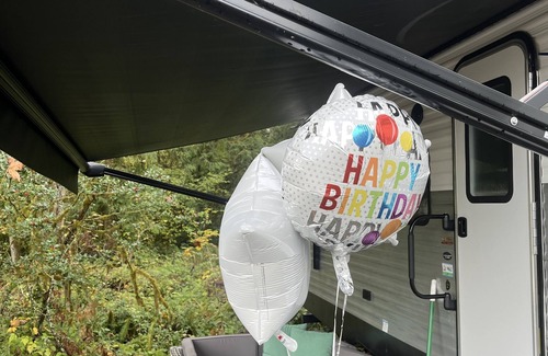 Enjoy the sounds of nature when you stay in this unique Shire themed 1 bd RV with both sunrise field views & sunset forest views. Snuggle up next to the fire on the patio for evening relaxation, or drink coffee while you spot the native birds. Far enough away from town, but close enough to drive 5min for delicious choices in local restaurants, wineries and taprooms. Also close by 10/15mins are activities like golf, horseback riding, hiking, waterfalls, swimming, festivals, & escape rooms. Non smoking property. The property outside the unit is shared with others including my family.