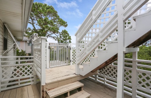 Woofs and Waves is a one-story, single level two bedroom home which makes access convenient and comfortable. There is as much living area outside as there is inside, so you’re sure to enjoy both. Under the house you’ll find a grilling area ideal for cooking family meals. On the main level, there is both a screened-in deck as well as an open, covered deck. In addition, you’ll find a widow’s walk above the house perfect for sunbathing. The best part is that you’ll be able to enjoy views of both the St. Joseph Bay and the Gulf of Mexico from up there.