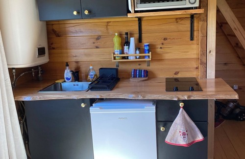 In the chalet there is a kitchen, living room, shower, toilet and on the first floor a bed for 2 person and 2 single beds.
