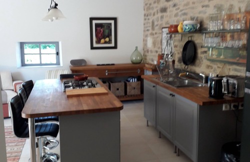 The old "porcherie" is a stunning gîte conversion of a former stone-built barn. The conversion, completed in 2016, has resulted in a contemporary, stylish look and feel, whilst retaining original stonework, wooden beams and feature windows. The two large bedrooms each have a double or kingsize bed, as well as a small single bed (80x190) if required. Both bedrooms have their own shower room with toilet and basin.