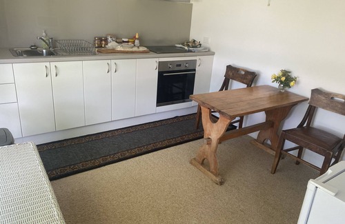 The flat has two bedrooms a king bed in one room and a queen in the second. There is a separate bathroom and kitchen which provides an electric oven, microwave and small fridge. Coffee tea milk bread and fresh farm eggs are provided.