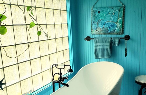 The bathroom is an escape in itself with a large tub sitting next to a wall of glass cubes. The wall filters the light, which is great for the plants around the tub but still maintains privacy. There is also a stand-up corner shower. The towels and floor mats have recently been replaced with fluffy brightly colored ones.