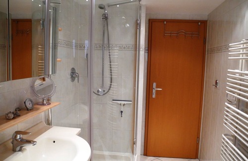 The guest area is located in the 1st. Floor and consists of a larger guest room (16 sqm), a smaller guest room (10 sqm), daylight bathroom with shower (5.5 sqm) and the hallway area (5.5 sqm). Both guest rooms share a bathroom.