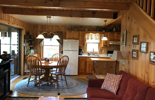 17 individual & separated cabins share the acreage and 1500 feet of waterfront (ours is @ the end of a road, quite private & no cars driving by!). Beautiful trails for hiking/mountain biking as well as winter snow-shoeing. The complex is on Goose Pond ( which connects to 900 acre Mousam Lake)--our dock is great for swimming, fishing, kayaking, paddle boarding, etc. Two kayaks are provided for your enjoyment on Goose Pond & Mousam Lake!The cabin has one bedroom with queen bed, 2 loft bedrooms-each with 2 twin beds, living-room with satellite TV, ample kitchen, full-sized dining area, full bathroom (shower), and large sun glass/screen in porch with sitting & dining area--with nice view of Kettle Pond & surrounding woods. Shapleigh is a small quiet town--yet only 15 min. to all your shopping needs.