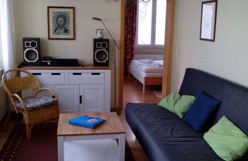 Villa Seeblick, two-room apartment, about 55sqm, bedroom, living room. with sofa bed, extra bed on request; Kitchenette in completely separate room, Stereoanl., 2xTV, bathroom with shower and washing machine. Sun from getting up to going to bed. Old town and lake view.