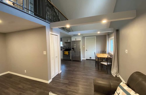 The space has two levels. The main floor has two bedrooms, one bathroom, laundry room, kitchen and living room. The second level has a third bedroom. Large backyard with a fire pit.