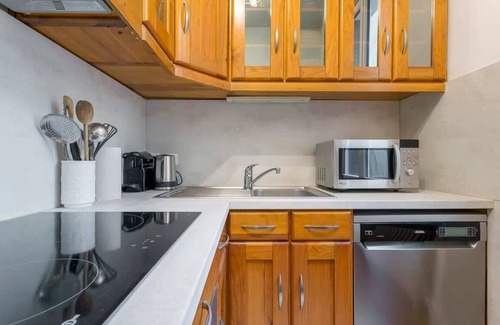 - A fully equipped kitchen: dishwasher, cooktop, oven, microwave.
