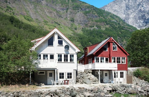 Very beautiful, comfortable timber house "Rødhette", built in 2012, surrounded by trees and meadows. 2 houses in the residence. 6 km from the centre of Gudvangen, 53 km from the centre of Voss, 96 km from the centre of Songdal, in a sunny position on a slope, 10 m from the fijord, direct access to the lagoon, in a cul-de-sac. For shared use: natural state property with meadow. (extra). Rowing boat with motor (on request), parking at the house. Shop 6 km, supermarket 26 km, restaurant 6 km, bus stop 6 km, railway station "Flåm" 26 km, ferry "Bergen" 146 km. Walking paths from the house 100 m, fishing possibilities 10 m. Nearby attractions: Flåmsbana 26 km. Please note: Property ref. NO1514.617.1 is situated on the same property. The boat is available approx. May til September.