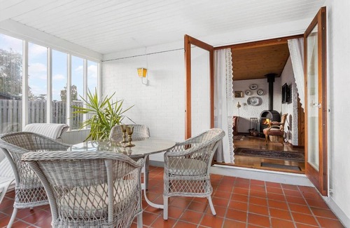 The generous living area, furnished with cozy older furniture, includes a dining space and leads into a bright, inviting winter garden, perfect for relaxation. A small, covered patio offers additional seating for less sunny days. The bathroom comes with a shower, sink, and toilet, while the two bedrooms contain one double bed and two single beds, accommodating up to four guests.