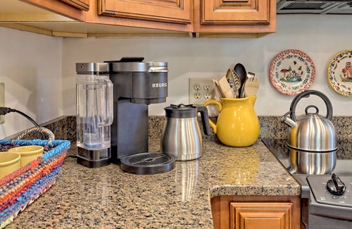 The master bedroom features wood ceilings, as well as an en-suite bathroom. It’s spacious, and also has a dedicated work space if needed. ** Please note that there is a per-visit $100 pet fee with a two-dog maximum. When requesting to book, select the box that you are bringing a pet and this will generate the fee—and let us know that you are. Thanks!