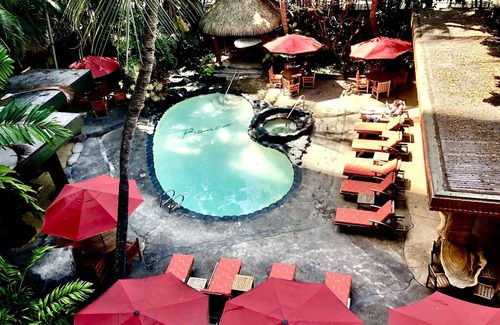 The courtyard is a charming tropical oasis featuring a lovely pool with a waterfall and an inviting hot tub surrounded by cabanas and lounge chairs. The Ko Tiki restaurant is convenient to grab a quick snack or meal.