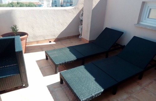 two terraces one for meals with table and 6 chairs and the other with garden furniture and deckchairs with sea view