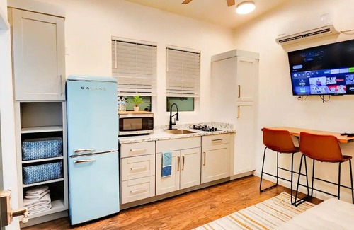 Escape to a tranquil oasis just minutes from downtown at Cecy and her husband's delightful tiny home/RV community. Tucked away behind the main house, guests are greeted by a shaded awning, outdoor picnic area, and twinkling lights that create a serene ambiance. The tiny house itself exudes charm and character, with thoughtful design details and clever craftsmanship evident throughout. From the high ceiling that eliminates any sense of claustrophobia to the luxurious step-in shower and large TV with superb sound, every aspect has been carefully considered to ensure a comfortable stay. .