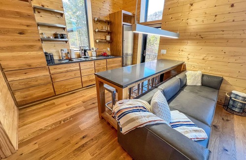The main living space offers living area, kitchen and primary bedroom and bath. On those cool evenings, you will love building a fire in the unique wood stove with glass front while you bake a pizza in the pizza oven up top. Curl up on the comfy couch and watch your favorite movie on the flat screen TV or just enjoy the view from outdoors.