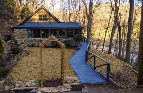 Enter an enchanting mix of rustic nostalgia and modern comforts within a harmonious aesthetic. Take in the river from the porch swing or hot tub, cozy up to the stone fireplace or outside fire pit. Fishing & skiing are close: 15 miles to Sugar or Beech Mountains.