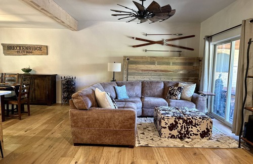 Cozy rustic leather sectional with custom Colorado moss rock fireplace with railroad tie mantel, functional full stocked kitchen with all the cooking and entertaining essentials, plenty of seating at counter and dining table. Buffet for serving and bar area with wine/beverage fridge.