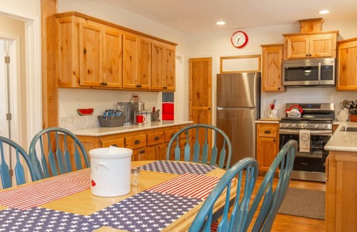 This farmhouse is spacious, clean, and equipped to meet all your needs for a relaxing stay (long or short). Take a load off in the extremely comfy Queen-sized beds. Storage for your items is no problem in the closets with hangers, shelves, and clothes baskets available. We've included an iron and full-size iron board as well. The kitchen has everything you need to prep tasty meals at any time of day. In the bathroom, we have everything stocked to ensure you feel comfortable. The living room can either be a relaxing space for a movie, a time for playing games at the foldout table, or a place to work comfortably at the writer's desk.