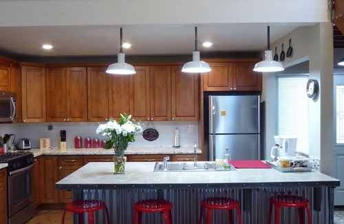 The Red Gate Retreat has recently been reincarnated – Everything has been remodeled and renewed in 2015, and new furniture in 2021, perfect for your relaxing retreat from normal life. The home feels cozy yet spacious, with a modern cabin-like charm with its vast windows, interesting angles, vaulted ceilings and skylights. As the remodel progressed, the unique character of the home revealed itself – we call it “clean, industrial, rustic, cottage.” (You have to be there to get it!) PLEASE NOTE: We're sorry, but due to the design of our staircase, our home is NOT suitable for children under 6 years old. Also, our natural yard beyond our decks is off limits.