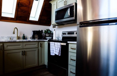 Perched on a lush hillside, 'Ravens Summit' is a newly constructed, two-story, loft-style cabin that sleeps 4, nestled in Campton in Red River Gorge. The cabin exudes warmth and authenticity with the open concept living area with large windows that flood the space with natural light. There's everything you need for an amazing Red River Gorge getaway and is decorated to make you feel right at home. Includes a fully equipped kitchen (standard coffee maker, Kuerig and microwave), electric stove, dishwasher, full size refrigerator, free WiFi, private hot tub, flat-screen TV, electric fireplace, charcoal grill (bring your own charcoal), outdoor fire pit, and Washer/Dryer.