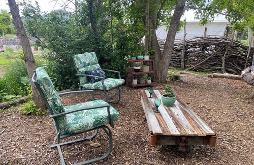 Your glamping site “Hug a Bear” is romantically lit at night time and artistically decorated. The tent is waterproof and protected by a carport, that offers a covered porch. The artwork (by Sabin, your host) covering the tent was exhibited at the McNichols Civic Center Building Downtown Denver a few years ago. Now it is enveloping your restful night under the starry sky of Colorado. The space offers you a coffee maker, a water kettle, water dispenser, BBQ and electricity. You will enjoy the delightful back side view of the famous Hogback mountain.