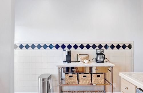 Inside, the spacious home can accommodate up to 12 guests comfortably. The main floor living area features a comfortable sectional, the perfect spot to cozy up and watch a movie. Off of the living area is the sunroom, equipped with a telescope to gaze at the stars and a day bed perfect for relaxing after a long day on the beach. The dining area offers seating for 4 at the table with an additional 4 at the bar. In the kitchen, guests can enjoy all the comforts of home while on vacation including small appliances, cookware, dinnerware, and ample counter space.
