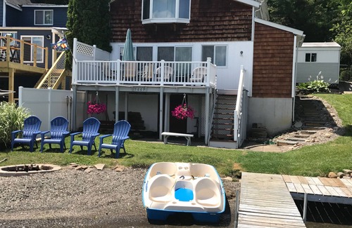 Outside enjoy the sunrise with a cup of coffee on the waterfront deck. Watch the kids swim or fish of off of the dock. There is a grassy area in front to play catch, corn hole, or other games. For meals use the grill at the side yard sitting area. Want to read a book? Use the sitting area off of the dock to relax. Grab a beverage from the refrigerator located in the 'basement' at lake level. At night use the lakeside firepit to cook s'mores and enjoy the tranquil sound of the waves on the shore.
