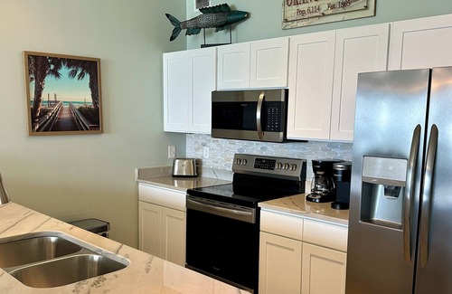 Our unit hosts a fully stocked kitchen with new stainless appliances, coffee maker and a full set of plates, glasses and utensils. An air mattress is available if needed. The separate wet bar features a new ice maker to ensure you have plenty of ice to enjoy your sunset cocktails on the deck.