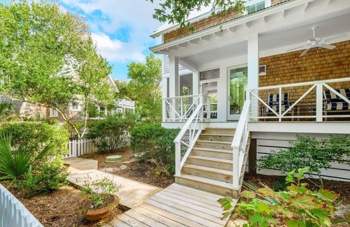2 homes, 2 kitchens, 2 crofters, 2 outdoor showers, 2 outdoor grills, 3 sets of washer/dryers and 3 golf carts all provide the opportunity to bring your extended family, large groups, or two families together while still allowing everyone to have their own space. Step through any of the six picket fence gates and be transformed as you take in the beauty of this charming property all brought together by boardwalks linking intimate outdoor spaces.