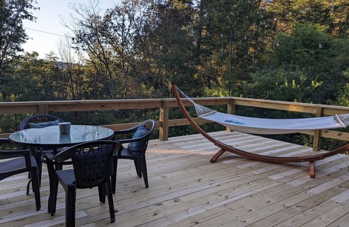 The cabin's main floor holds the kitchen, dining space, and living room with glass doors out to the deck. Our kitchen is fully stocked with dishes, utensils, pots and pans, appliances, coffee, tea, spices, oils, and more. The main floor also has a bedroom with queen bed. Upstairs is a loft area perfect for reading or games and taking in the beautiful view, and a bathroom with shower.