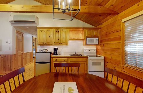 Inside, you'll find a fully equipped kitchen featuring a 3/4 size refrigerator, stove, microwave, and coffee pot, perfect for preparing meals to enjoy at the dining table. After a day of exploration, gather around the firepit outside for s'mores and stargazing. The cabin is dog-friendly, so your furry companions can join the fun!