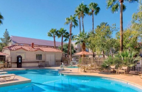 Unwind in simplicity at this centrally-located, peaceful private condo resort. After indulging in the glamour of Las Vegas with its casinos, shows, and restaurants, take a break at this two-level, adobe-style haven just minutes from the Strip. Your home-away-from-home 2-BR Condo offers a pool, Jacuzzi, FREE parking, shuttle service, and NO Resort fees in the relaxed part of town near the world-famous Las Vegas Strip.