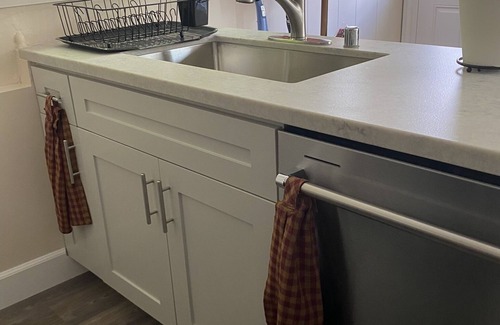 The kitchenette offers a compact refrigerator and freezer, Kitchen Aid Dishwasher, microwave, sink with garbage disposal, and a high-end large capacity Breville Smart Oven. The kitchenette cupboards hold linens, dishes, bowls, mugs, and glasses; a full set of cutlery with many kitchen gadgets in a drawer as well as a stove top kettle and electric kettle. A Panini Press, crock pot, Indoor electric grill, cooler, and picnic gear are available for the use of our guests during their stay. We have stocked the cottage pantry with basic herbs, spices, salt, pepper, oil and vinegar. We also provide an initial supply of paper products (paper towels, napkins, paper plates, and plastic cups for use around the pool, etc.).