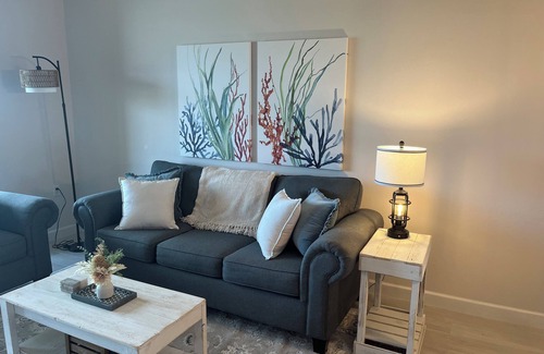 Step inside to find a bright, coastal-inspired retreat designed for comfort and convenience. The master suite features a brand-new king bed with luxury linens, while the guest bedroom offers cozy twin beds—both with generous closets stocked with quality hangers, laundry baskets, and plenty of space to unpack and feel at home.