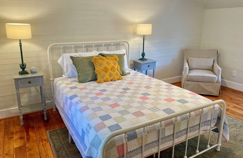 The updated 2000 sq. ft. farmhouse has 3 bedrooms, 3 baths, and accommodates 6-7 people (please note rental rate is based on the number of guests). Master bedroom upstairs with queen bed and private bath; 2 other upstairs bedrooms with 1 queen, 1 full and 1 twin. Fully equipped, modern kitchen. Linens, towels, and paper products furnished. Streaming TV in living room and one bedroom. Dedicated office workspace upstairs. Excellent WiFi. Good cell service.