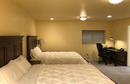 This is a private, entire floor of a three-story house ( No one is sharing any room and anything with you throughout the entire house ). Your friends and family have plenty of room. This unit can comfortably accommodate 10 people. There is a big bedroom with 2 queen beds, a large bedroom with a king size bed and sofa bed, and a huge living room with a sofa bed and couch. The unit has its own mountain and water views. It has a private entry from the attached garage and a private side door to the living room. It has its own patio, kitchen, living room, eating area, laundry room, and a full bathroom, not shared.