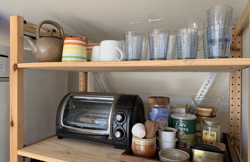 Two, private bedrooms with one queen and one full bed. Wood burning stove with plenty of firewood, and a stocked kitchen; everything you need for cooking gourmet meals.