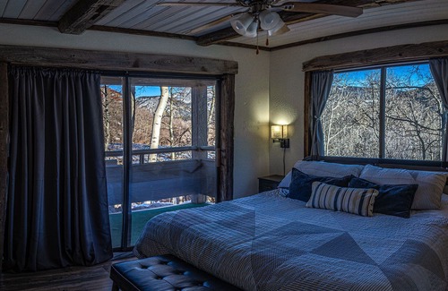 The master bedroom is very cozy with a king bed and comfortable bedding/pillows. Another 55” Smart TV with streaming. Two lamps with available USB charging ports and two small nightstands. There is also a convenient bench, chair, and shelf for storing your personal items. We have a cozy work space with a 27” monitor you can connect to your laptop via HDMI. The blackout curtains/shades make it easy to catch up on some much needed rest. You can see the top of the West Spanish Peak from the private bedroom patio with a small couch for two and a fold out table which is great for your laptop or sit back and enjoy a nice cup of coffee.