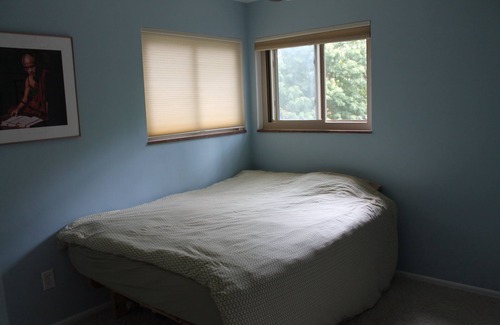 All of the bedrooms and full bath are clustered together in a short hallway close to the main living space. Bedroom 1 has a queen size bed; bedroom 2 has a queen and a full size (right next to each other); bedroom 3 has a single and a crib, and bedroom 4 has a king size bed (bathroom attached, with outside bathroom door leading to kitchen area). Beds in bedroom 2 and 3 are on the floor (or boxspring). A queen size air mattress fits downstairs in our downstairs living room (half bathroom located downstairs through the laundry room) and the sunroom has a couch that converts into a bed also (note that the sunroom does not have shades).