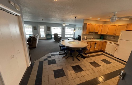 This level you will have direct access from the driveway and enter into the kitchen area. Fully stocked kitchen to prepare home made meals with plenty of storage and counter space, microwave, toaster, Keurig , teapot and all other essentials available. Large unique round kitchen table with seating for 10, which then opens up into the wide open living space. To the left of the room is couch with seating for 6 and a recliner to view the 86” flatscreen tv ( equipped with Roku access) and a beautiful view of the lake with large lake front windows. To the right additional seating/bedding with a futon and recliner .this level has direct access to the upper deck with out door seating and table to enjoy meals outside and BBQ grill . Full bathroom on this level with tub/shower combo