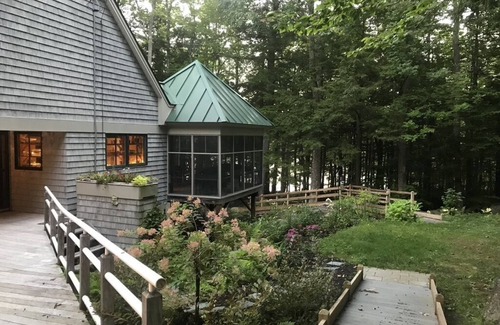 Modern post & beam light filled camp in the woods on beautiful Parker Pond. Walk down the path to private dock for swimming, kayaking & canoeing. Designed by my Dad in 1998, this property offers a peaceful haven for those seeking a quiet and harmonious stay, where they can enjoy the comforts of home while respecting the tranquility valued by our neighbors.