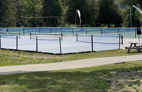 Inside you’ll find 2 bedrooms and 1 bathroom, the first bedroom has a queen bed, a desk and a TV. The 2nd bedroom has a twin on top of full bunk bed and a TV. The lower level has a large family room with a futon that can be folded down to sleep 2.